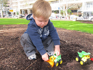 Sticks. Dirt. Dig. Dump. Dig. That is what it is about for my boys.  We spent hours each week in the park across the street digging in the dirt and playing with sticks.  We use our plastic construction trucks from Walgreens (these are the BEST by the way) digging holes, lifting a load, dumping that load into the dump truck over and over again.  And the sticks, who knew there were so many uses for them– digging, scraping, swatting, building, sweeping, writing, piling- you name it, we have done it with a stick.  I sit with them and try to see what they see.  There is a whole world going on. For my 2.5 year old, it is mostly the action of using the digger to pick up the dirt, to dump it into the truck and then to dump that load to the ground.  He does it in such a slow, methodical manner as if every millimeter he moves is vitally important.  My 5 year old, on the other hand, is telling a story. Whether it is an intricate story of the happenings at a construction site or a simple story of a digger doing its job, it completely becomes his world for that moment in time.  I do enjoy digging with them for a while. It is fun to get down into the dirt and to feel the earth in my hands. But my story is not the same as either of the boys’ stories. My story is simply being with my boys.